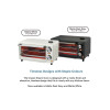 A detachable crumb tray allows easy cleaning of bread crumbs or bits of food that fall through. It comes with 1 baking tray, 1 pizza pan, a baking rack, and tongs for easier handling.