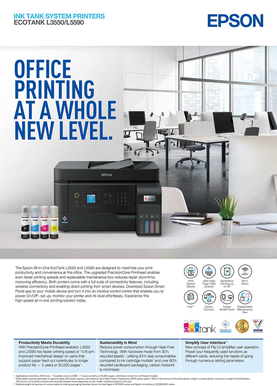 Save up to 90% on printing costs1 with Epson’s cartridge-free EcoTank printers. Supplied with high yield ink bottles, the integrated ink tanks are easy to fill thanks to the specially engineered ink bottles. With no cartridges to replace and flexible connectivity features, this is the perfect printer for anyone looking for high-quality prints at an incredibly low cost per page.